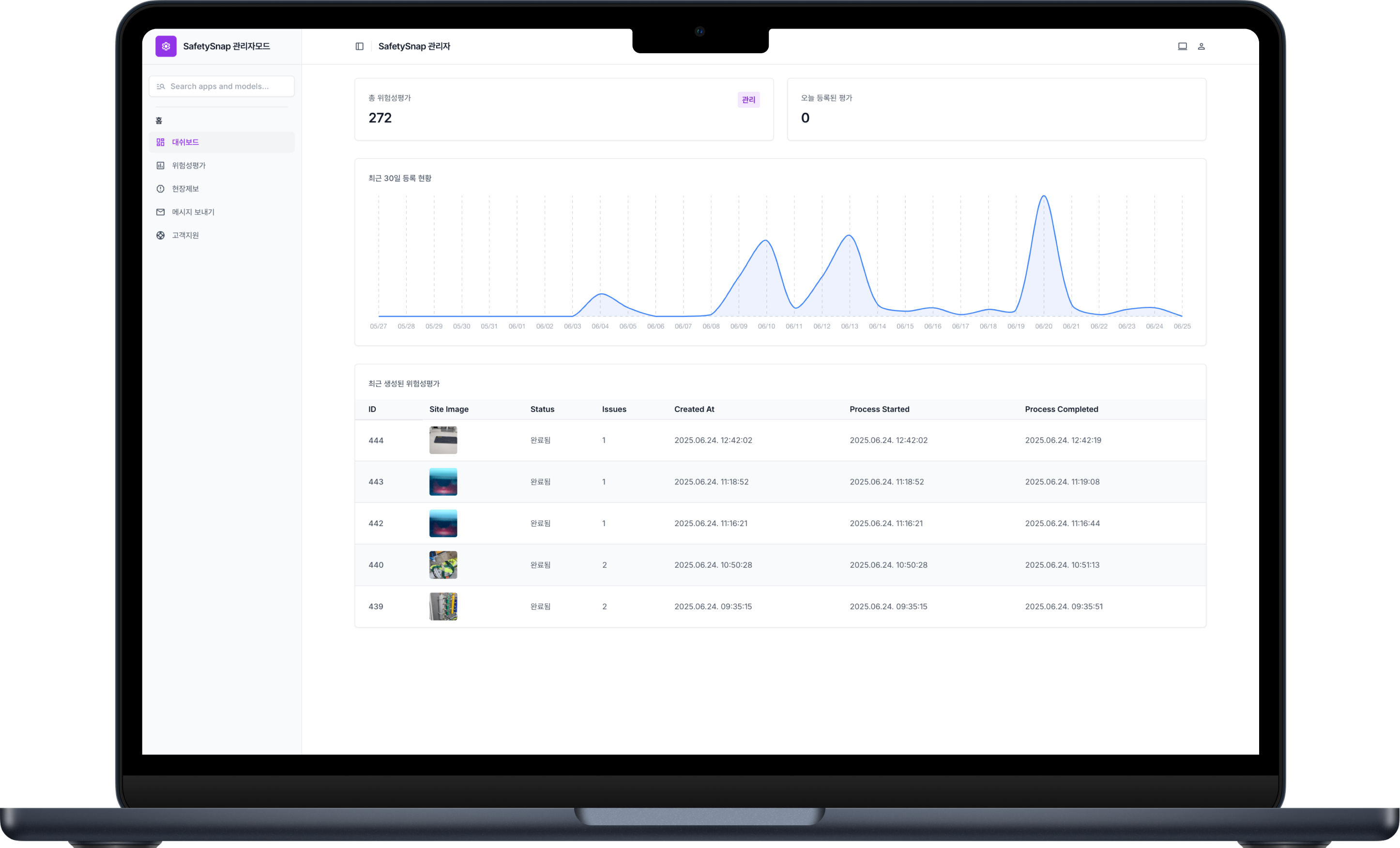 사업장/공정 별 위험요소 발생 현황을 실시간으로 확인하고, 위험도 분포/개선이력/반복 위험 등의 통계를 제공합니다.