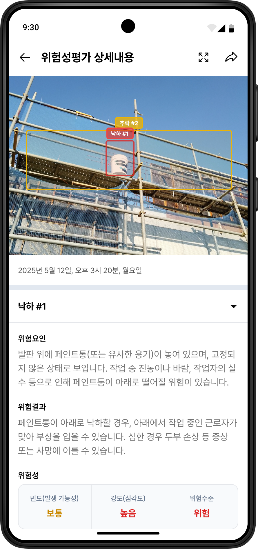 모바일 기기로 촬영하여 AI가 자동으로 분석위험 요소와 불안전 상태를 신속히 감지합니다.